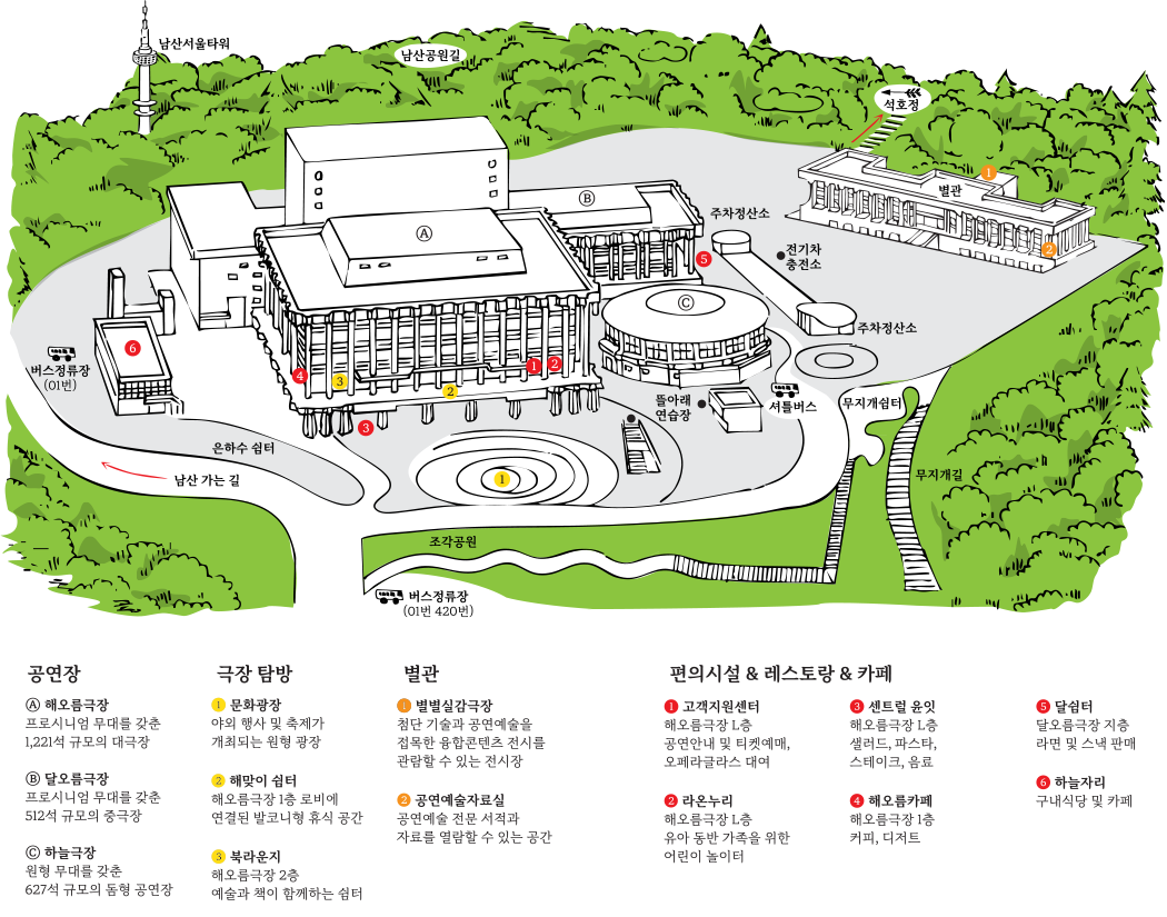 국립극장 직원 및 남산 방문객에게 식사 및 커피와 차를 판매하는 식당입니다.