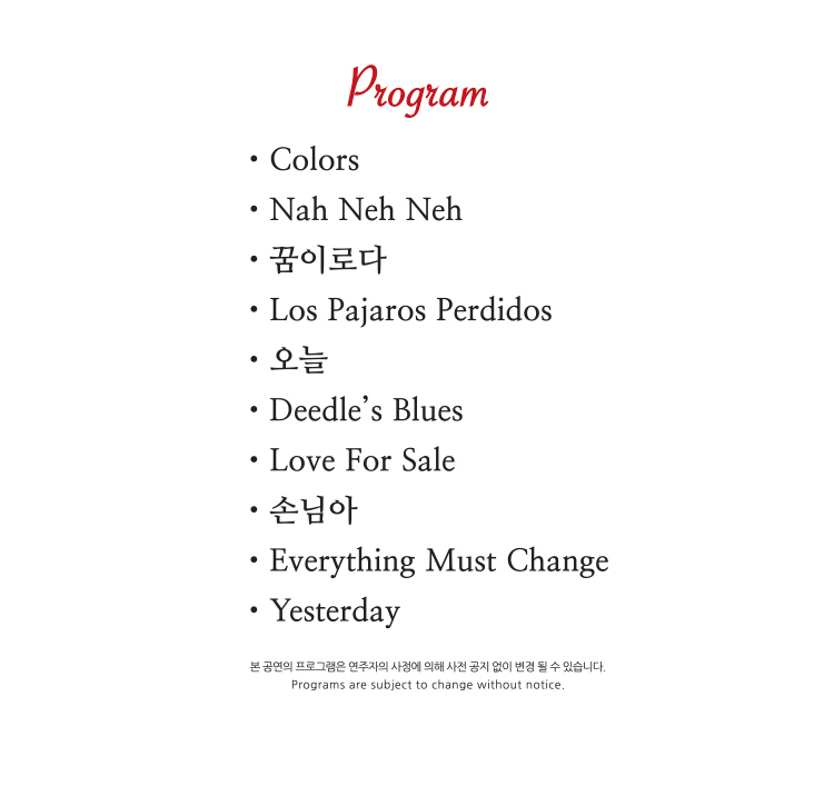 스페셜 게스트로 이재하(거문고), 방지원(장구)이 합류해 전통과 현대의 호흡을 확장한다. 여기에 한국 재즈 색소폰의 대표 주자 이정식(색소폰), 집시 바이올리니스트 KON의 협연과 현대무용가 이루다가 함께하여 즉흥성과 서정, 다이나믹과 깊이가 교차하는 스펙트럼을 완성한다.