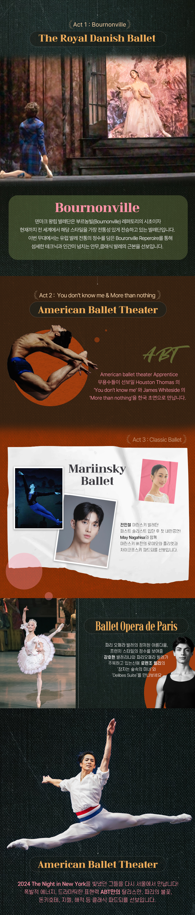 2024 The Night in New York을 빛냈던 그들이 다시 서울에서 만납니다! 폭발적 에너지, 드라마틱한 표현력 ABT만의 탈리스만, 파리의 불꽃, 돈키호테, 지젤, 해적 등 클래식 파드되를 선보입니다.