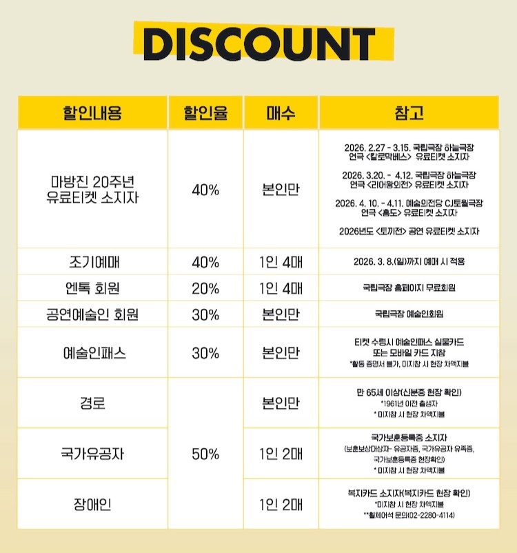 · 당일 예매 티켓 수령 및 현장 구매는 공연 시작 1시간 전부터 가능합니다.