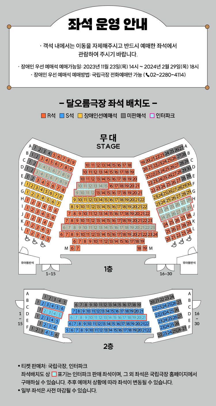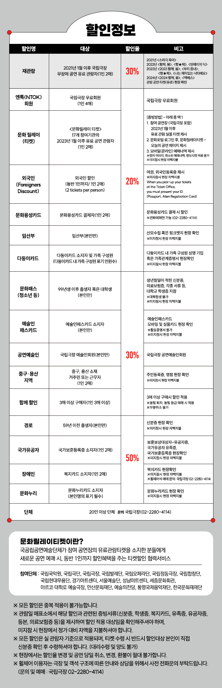 2) 예매 티켓 수령 및 현장 구매는 공연 시작 1시간 전부터 가능하며, 공연 시작 전 매표소가 혼잡하오니 되도록 공연 시작 30분 전까지 입장권을 수령하여 주시기 바랍니다.