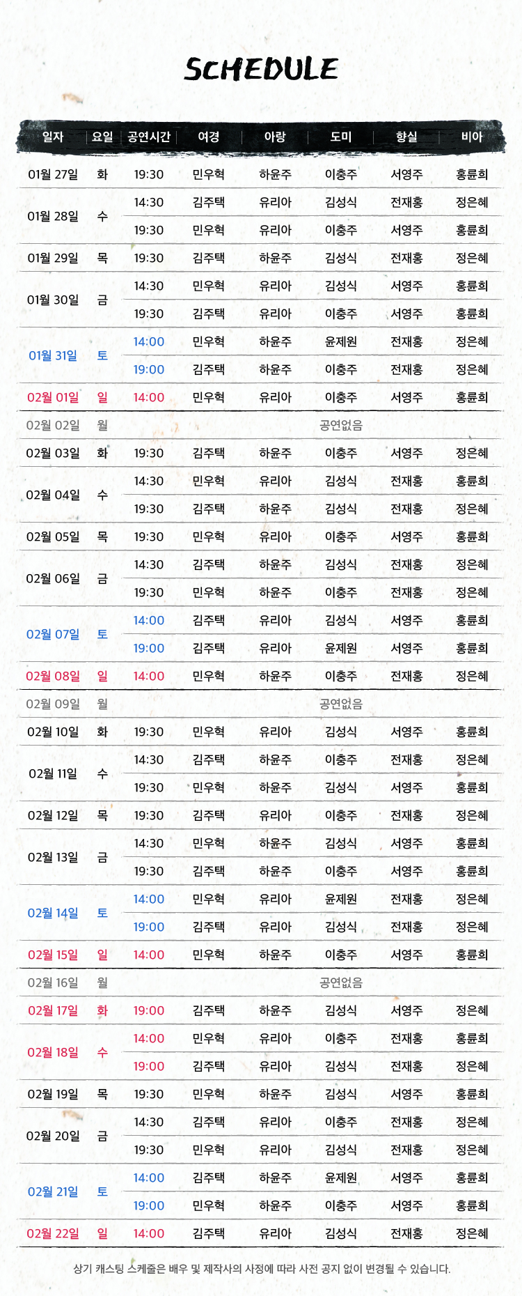 -캐스팅 출연 일정은 배우 및 제작사의 사정에 의해 사전 공지 없이 변경될 수 있습니다.