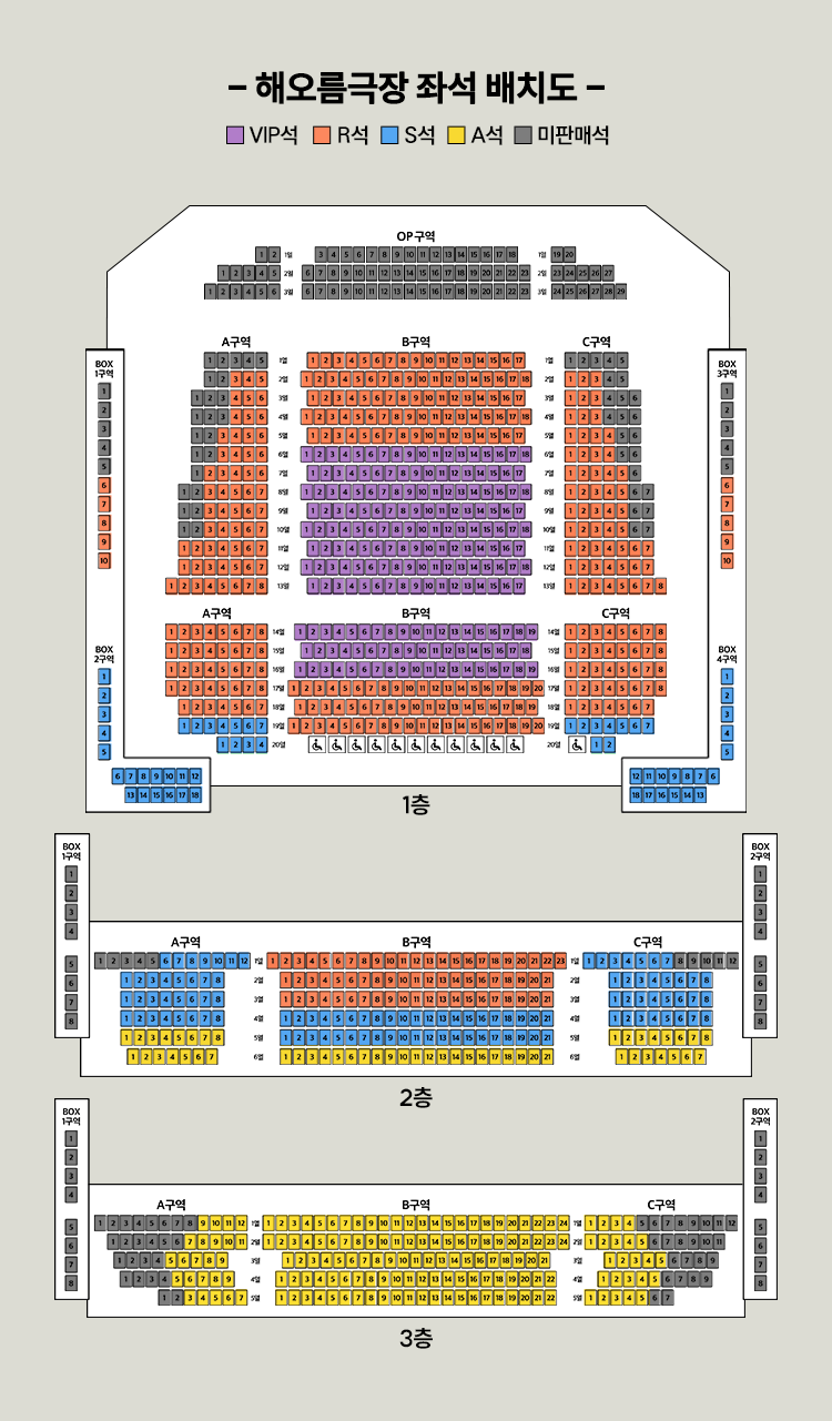 - 휠체어석 위치: 국립극장 해오름극장 무대를 정면에 두고 1층 중앙블록 후면 11석, 오른쪽블록 후면 1석 (*국립극장 해오름극장 휠체어석 위치 확인하기)