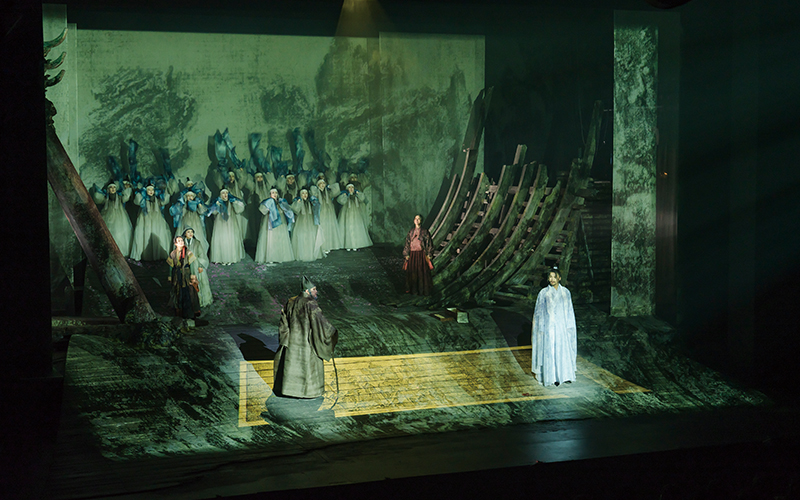 〈보허자〉에 첫 번째로 눈과 귀를 빼앗긴 요소는 탄탄한 앙상블이라 할 수 있다. 첫 장면과 마지막 장면에서 “보허- 능허- 보허등공” 하며 무릉도원을 꿈꿨지만, 폐허가 된 공허함을 공간화하는 합창은 관객의 마음도 텅 비워 냈다. 천수경과 관음보살을 부르는 장면 역시 이승과 저승의 틈을 소리와 음악으로 구현하는데 서늘한 아름다움이 느껴진다. 허공을 걷는 자의 공간을 무대화하는 데 성공한 듯 보인다. 국립창극단만이 할 수 있는 앙상블은 무대의 장면을 관객에게 청각적인 파워로 전달할 수 있으며, 극 전체의 긴장과 이완의 균형을 잡는 데도 유용하다.